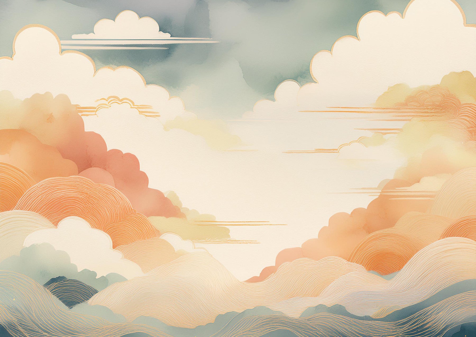 Experience the magic of the golden hour with this stunning wallpaper. The soft watercolor palette of peach, beige, and sage green evokes the warm, calming light of sunrise or sunset. Intricate gold linework adds depth and texture to the rolling clouds and hills, creating a sense of serene tranquility. This wallpaper is perfect for adding a touch of sophisticated elegance and peaceful beauty to any room in your home. The subtle color variations and seamless pattern make it a versatile choice for a variety of interior design styles.